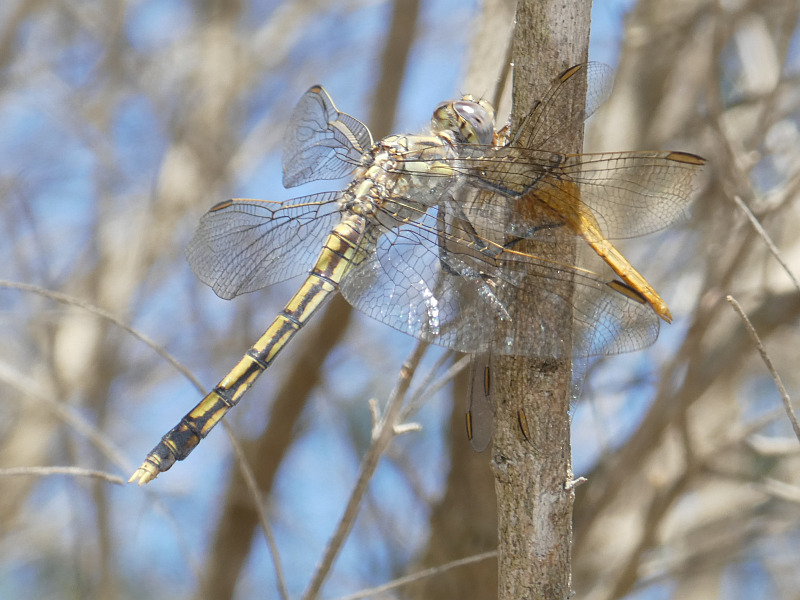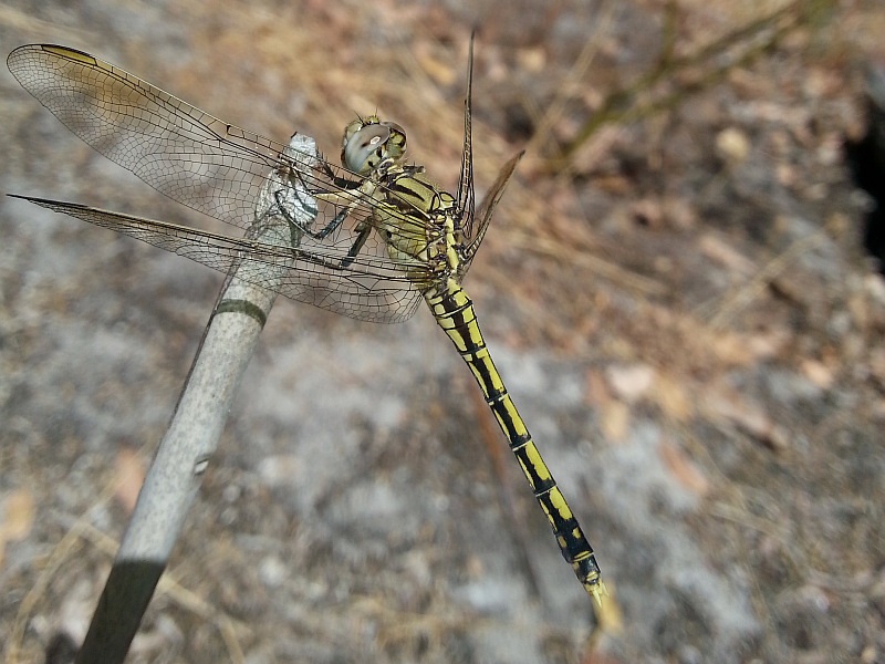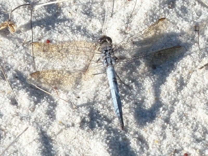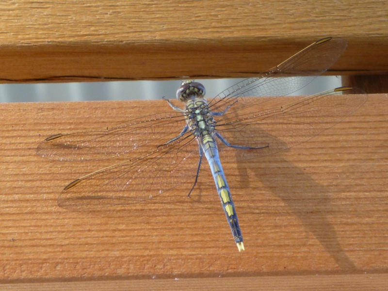 All blue skimmers are yellow with black makings when they first emerge from the nymph. Males turn blue as they mature, females remain yellow and black but can gain a small amount of blue.