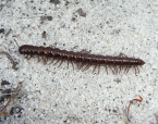 The Portuguese Millipede is black and looks smooth and can also be found around and inside houses. The Marri Millipede is brown and looks like a string of beads and rarely leaves the bushland. Both are about 4cm long.