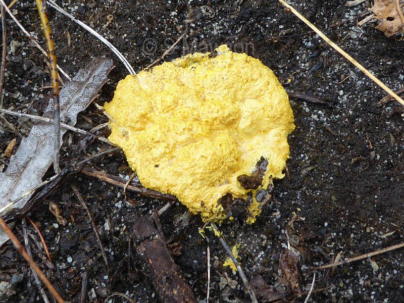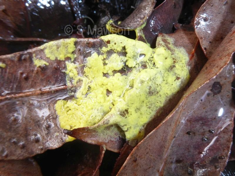 Slimy yellow fruiting body found on leaf litter.